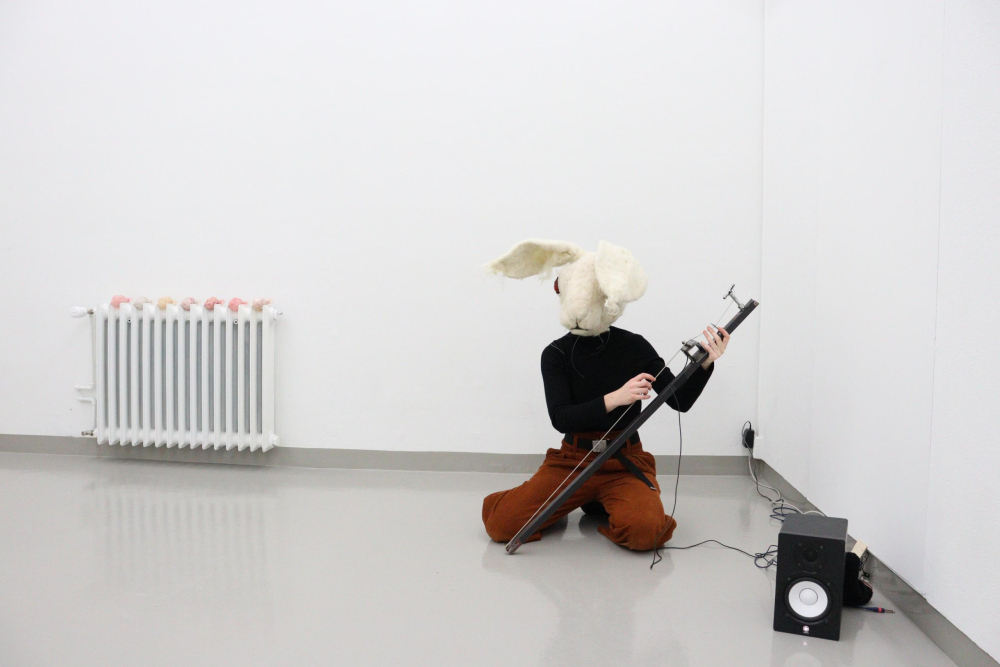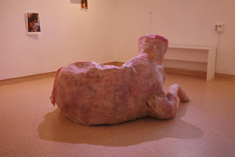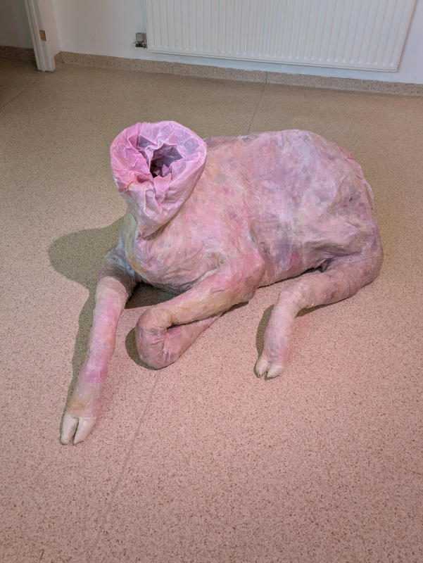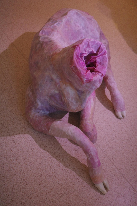 Sunniva Allanic’s sculpture lies in the center of the space: a fleshy tunnel through which air and time flow. It remains unclear whether this creature—nearly, but not quite, a familiar shape—requires our care to maintain itself. Ultimately, the work questions our role as humans, asking us to consider the nature of our intervention in the lives of other beings.